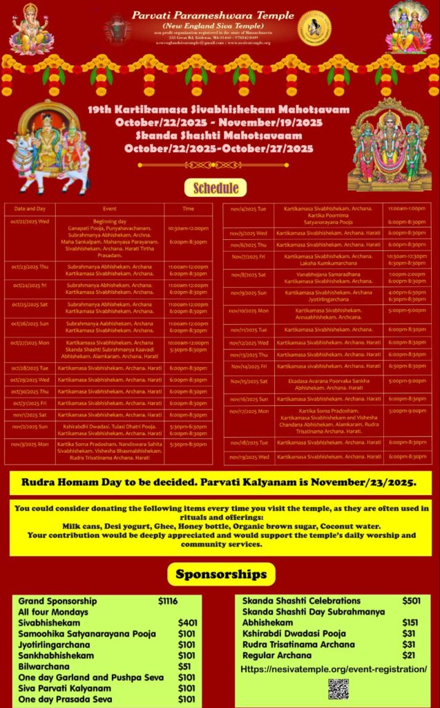 Vaidika Gruham/Abdika Gruham : Parvati Parameshwara Temple has a special place to perform Abdikam with all facilities (Anna Shradham’s) first year three day’s Shradham’s. please call for more details at 9788421009.